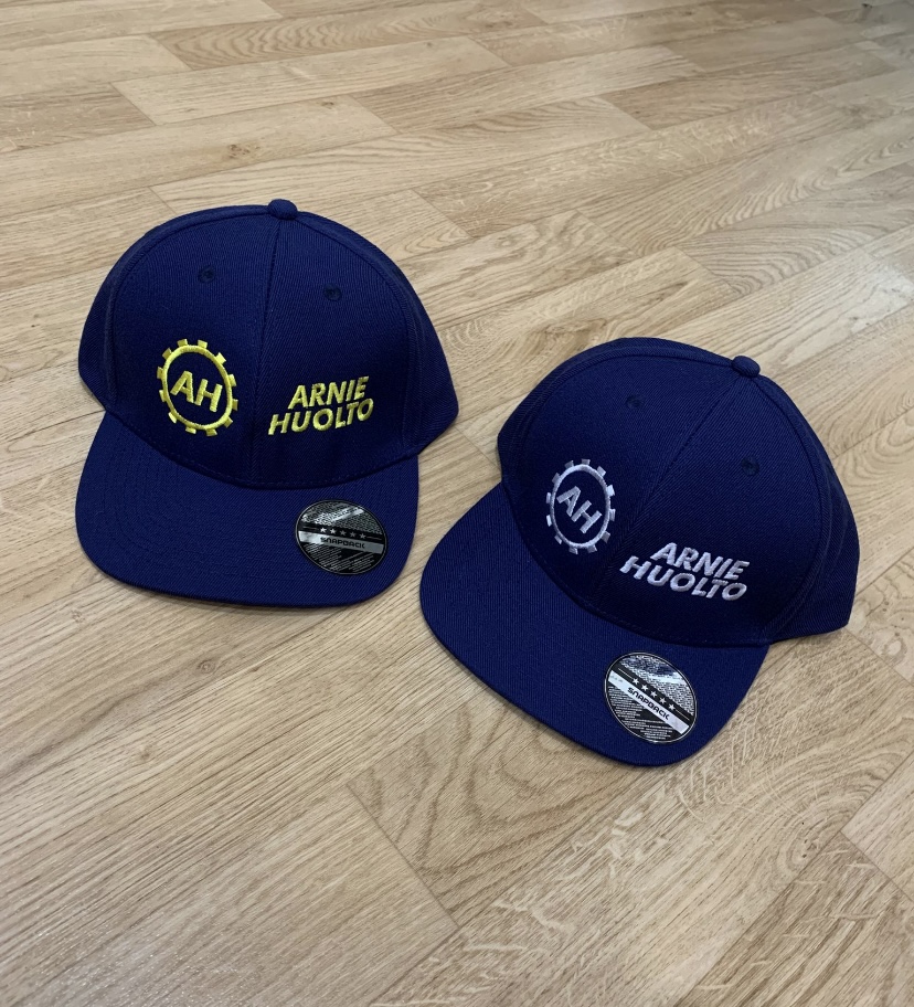 Arnie Huolto lippalakki snapback. Lippiksen väri navy blue ja logo keltainen tai harmaa